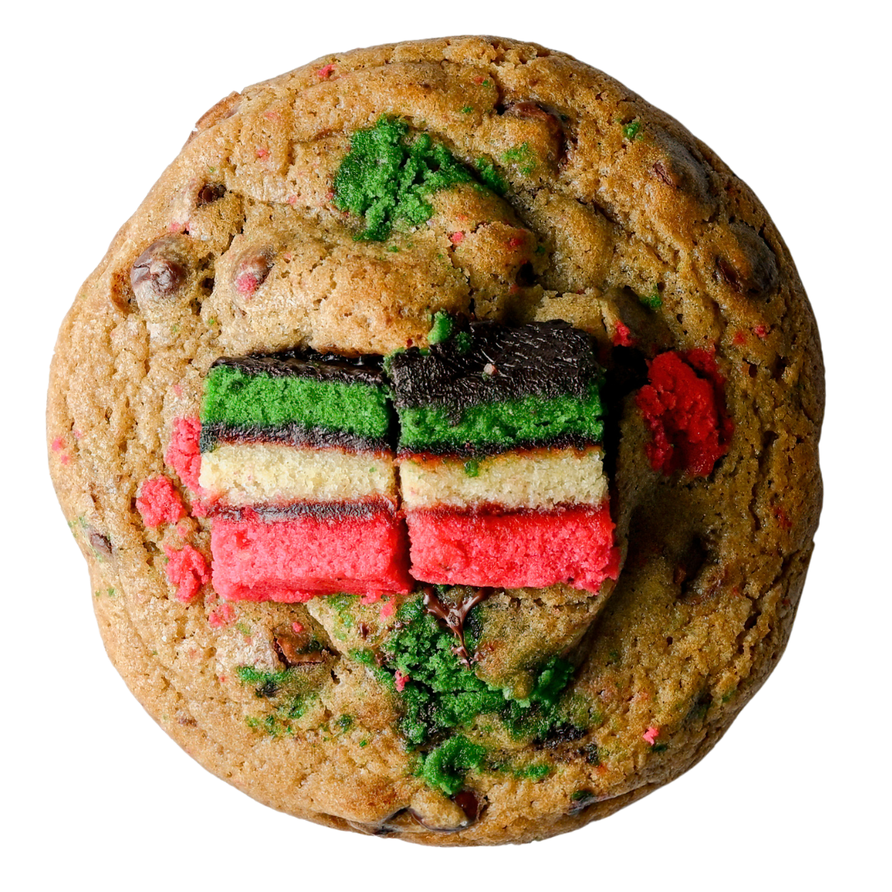 A warm, gooey chocolate chip cookie enveloping a rich, buttery Italian rainbow cookie.